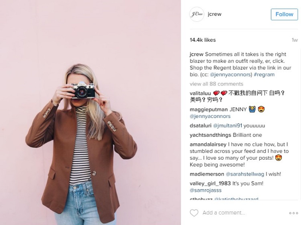 Takeaway: Including strong CTAs in your Instagram posts is a great way to encourage customers to purchase your products. Beginning this month, Instagram has started testing a mobile shopping feature that allows Instagram users to shop products feature in Instagram posts. And J. Crew is among the 20 U.S.-based retail brands involved in the test launch.