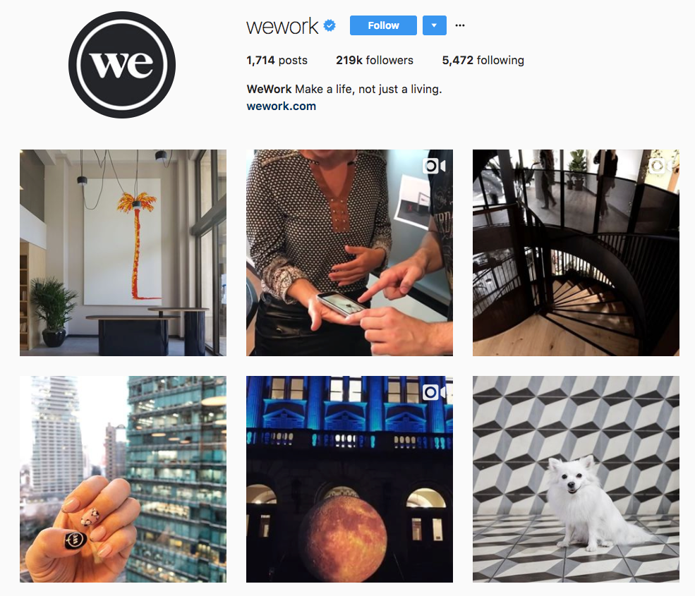 Instead of using Instagram to solely promote its own company and employees, WeWork highlights customer success stories. The company’s feed often features the companies that populate its co-working spaces, and the beautiful images inspire others to take up residence in the startup space.