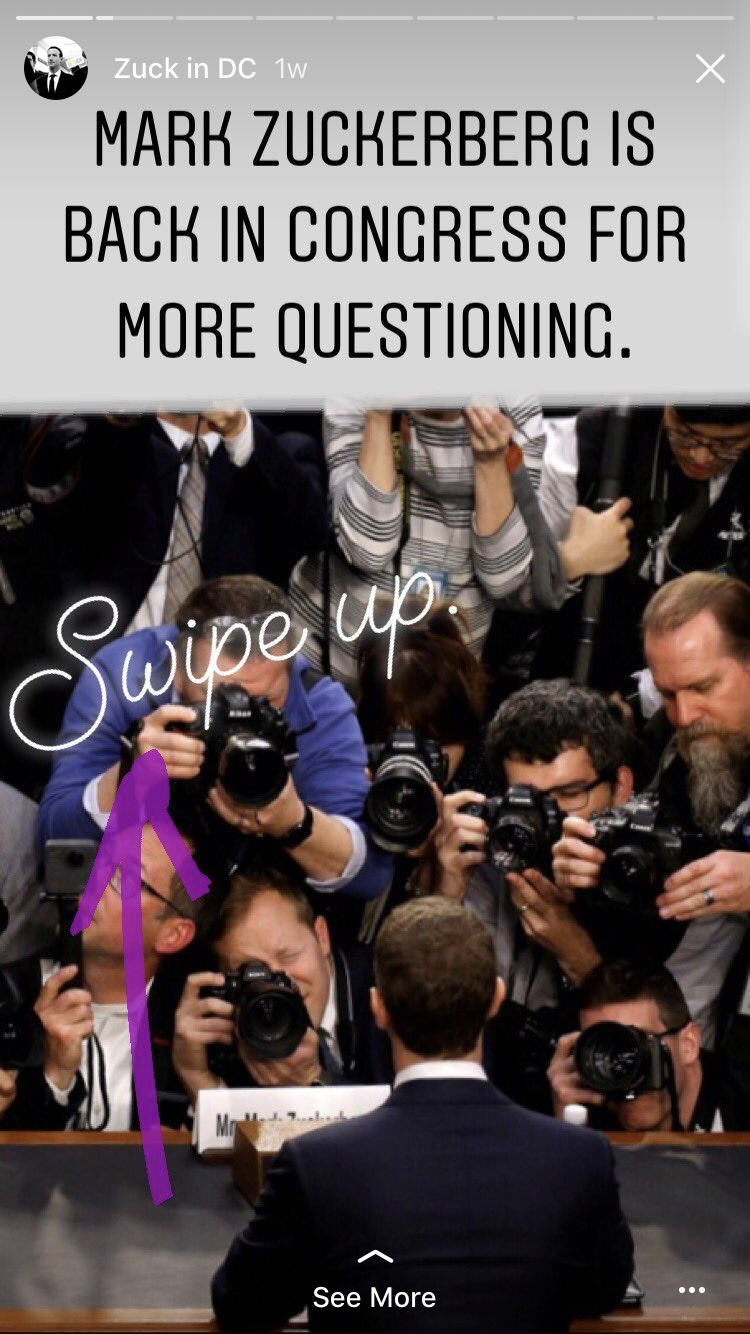 The latest Instagram Stories Highlight from BBC News features various clips and images for when Mark Zuckerberg was in Congress for more questioning. In each of the content they added to the Highlight, they've included a link to the article, driving more traffic.